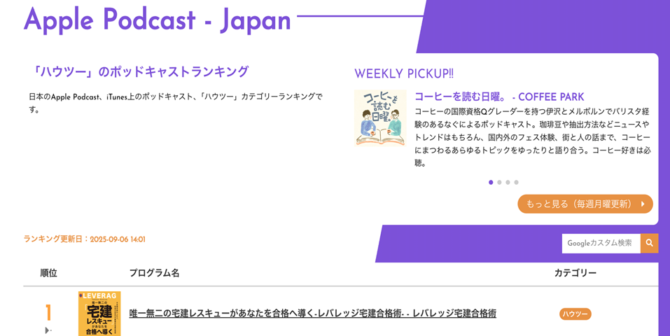 2025年9月6日時点で、Apple Podcastハウツー部門ランキングで1位。