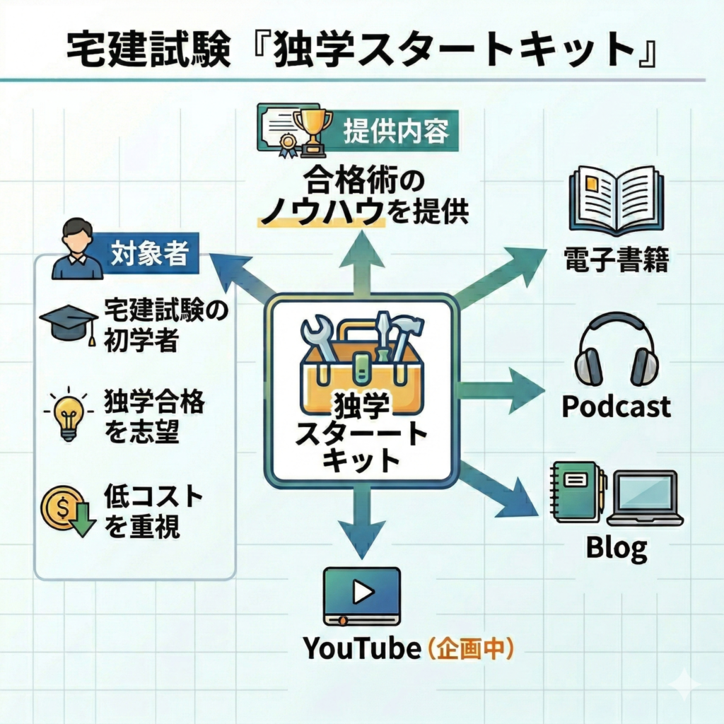独学スタートキットは、宅建試験の初学者で、出来るだけコストを掛けずに独学で試験に合格をされたい人に向けて、電子書籍、Podcast、Blog、YouTube(企画中)を通じてレバレッジ宅建合格術のノウハウを提供をしています。