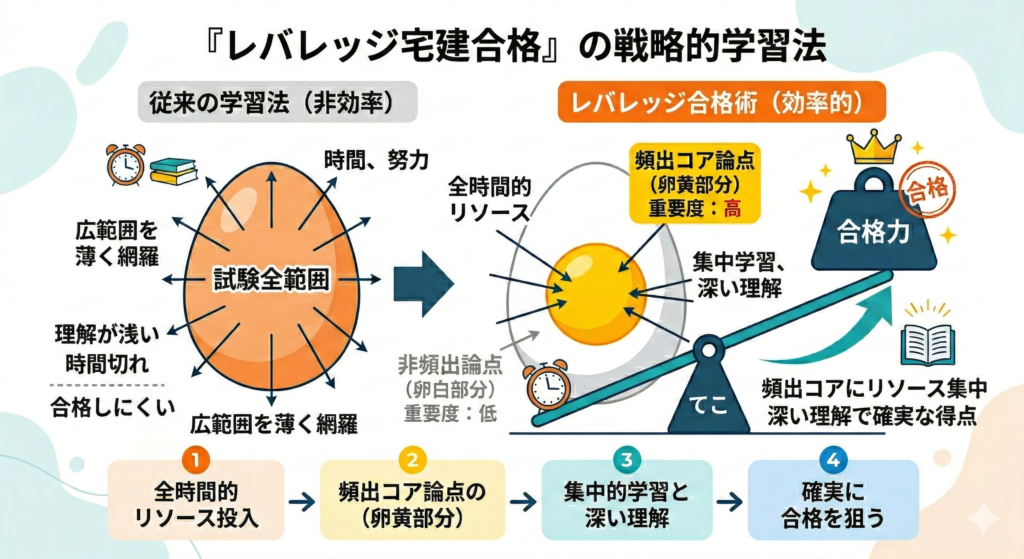 レバレッジ宅建合格術は、出題頻度の高い頻出コア論点(卵黄部分)に、全ての時間的リソースを集中させ、深い理解を得ることで合格を勝ち取る戦略的学習法です。
